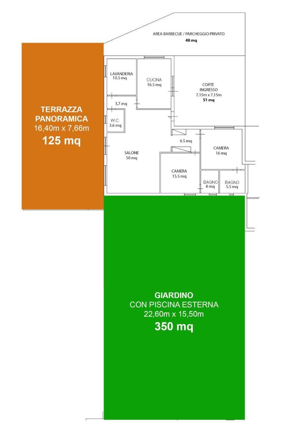 Si accede al comprensorio tramite un cancello elettrico che immette in un verde e curato giardino comune affiancato ad una comoda piazzetta dove poter posteggiare le auto. Di fronte l'accesso dell'immobile c'è uno spazio privato dedicato all'area parcheggio e zona barbecue (circa 48mq). L'ingresso della villetta ha a servizio una ampia corte recintata in legno (di circa 50 mq). Varcata la soglia d'ingresso si è subito al centro di questa grande e luminosa zona giorno dotata di tutti i confort. Gli spazi di questo moderno immobile (di circa 150 mq interni) sono stati sapientemente studiati e ottimizzati. La zona giorno è direttamente connessa alla grande cucina indipendente attraverso ampi archi che oltre a permettere il passaggio della luce garantiscono la convivialità sia in serate con amici che nella routin quotidiana. Quest'area è il fulcro della casa da cui si può accedere ad ogni ambiente. Attraverso un comodo disimpegno armonizzato nella planimetria si accede alla zona lavanderia e ad un bagno per gli ospiti. Dall'altro lato del salone invece, attraverso un ampio disimpegno con armadiature a muro, si può accedere alla zona notte con due grandi camere da letto con il proprio bagno en suite. La zona giorno immette direttamente anche nella grande terrazza panoramica (di circa 125mq) con affacci sul verde , esposta a SUD, che non aspetta altro di essere piantumata ed arredata. Dalla terrazza è possibile da un lato, attraverso un grazioso corridoio contornato dal verde, ritornare all'area barbecue e all’ingresso della villa e dall'altro raggiungere questo curato giardino privato (di circa 350 mq) con area piscina contornato da siepi che garantiscono una totale privacy.