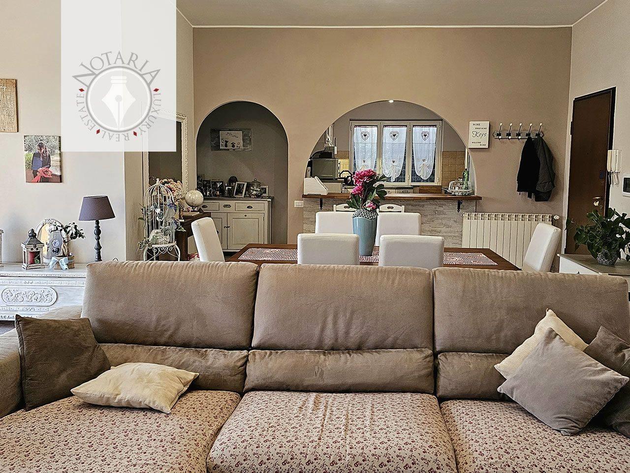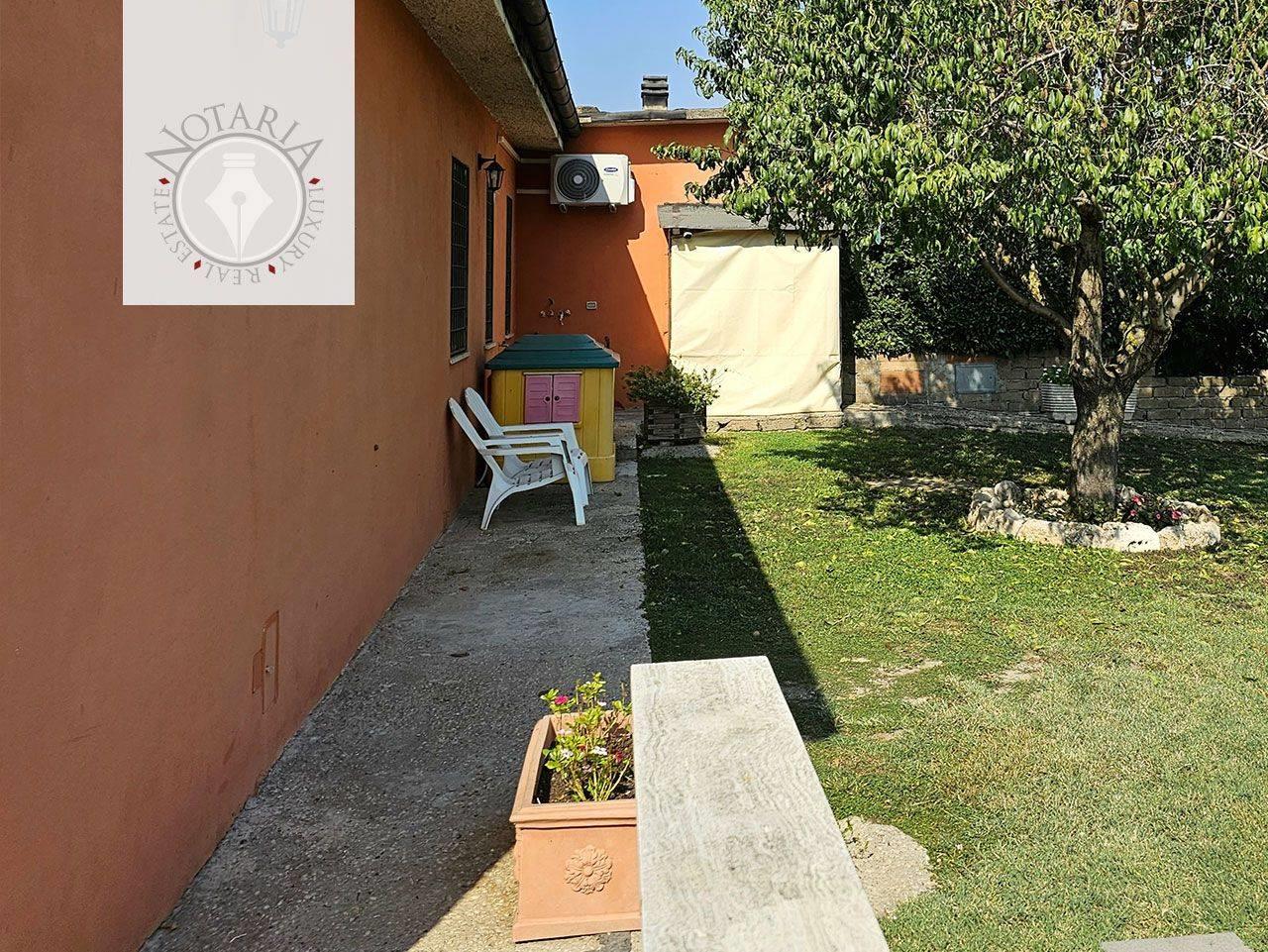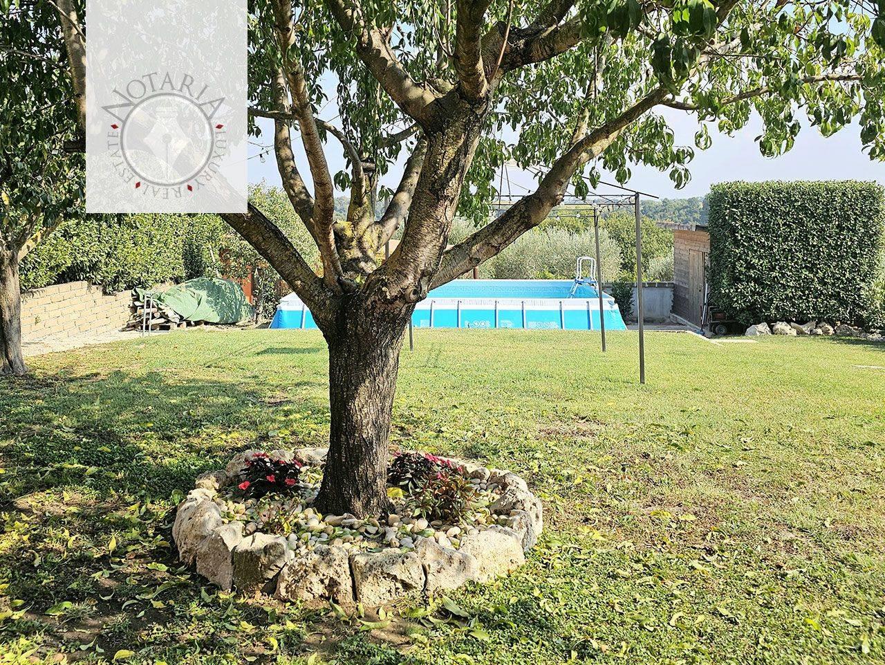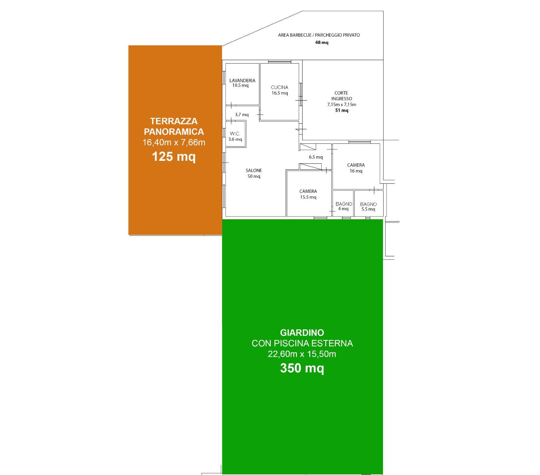 Si accede al comprensorio tramite un cancello elettrico che immette in un verde e curato giardino comune affiancato ad una comoda piazzetta dove poter posteggiare le auto. Di fronte l'accesso dell'immobile c'è uno spazio privato dedicato all'area parcheggio e zona barbecue (circa 48mq). L'ingresso della villetta ha a servizio una ampia corte recintata in legno (di circa 50 mq). Varcata la soglia d'ingresso si è subito al centro di questa grande e luminosa zona giorno dotata di tutti i confort. Gli spazi di questo moderno immobile (di circa 150 mq interni) sono stati sapientemente studiati e ottimizzati. La zona giorno è direttamente connessa alla grande cucina indipendente attraverso ampi archi che oltre a permettere il passaggio della luce garantiscono la convivialità sia in serate con amici che nella routin quotidiana. Quest'area è il fulcro della casa da cui si può accedere ad ogni ambiente. Attraverso un comodo disimpegno armonizzato nella planimetria si accede alla zona lavanderia e ad un bagno per gli ospiti. Dall'altro lato del salone invece,attraverso un ampio disimpegno con armadiature a muro, si può accedere alla zona notte con due grandi camere da letto con il proprio bagno en suite. La zona giorno immette direttamente anche nella grande terrazza panoramica (di circa 125mq) con affacci sul verde , esposta a SUD, che non aspetta altro di essere piantumata ed arredata. Dalla terrazza è possibile da un lato, attraverso un grazioso corridoio contornato dal verde, ritornare all'area barbecue e all’ingresso della villa e dall'altro raggiungere questo curato giardino privato (di circa 350 mq) con area piscina contornato da siepi che garantiscono una totale privacy.