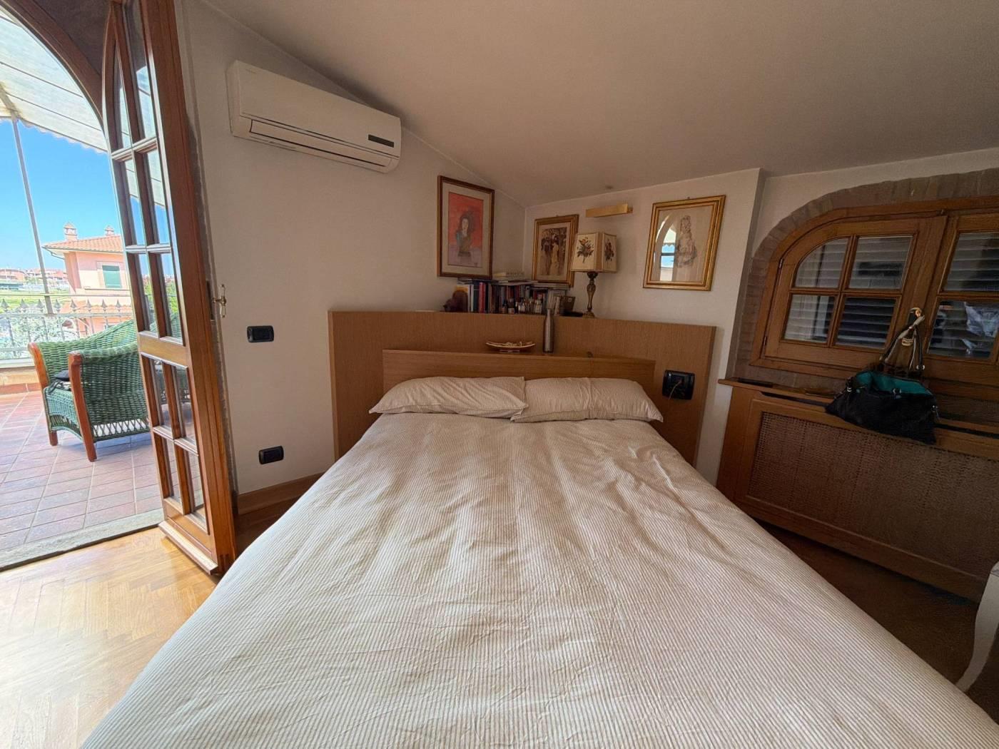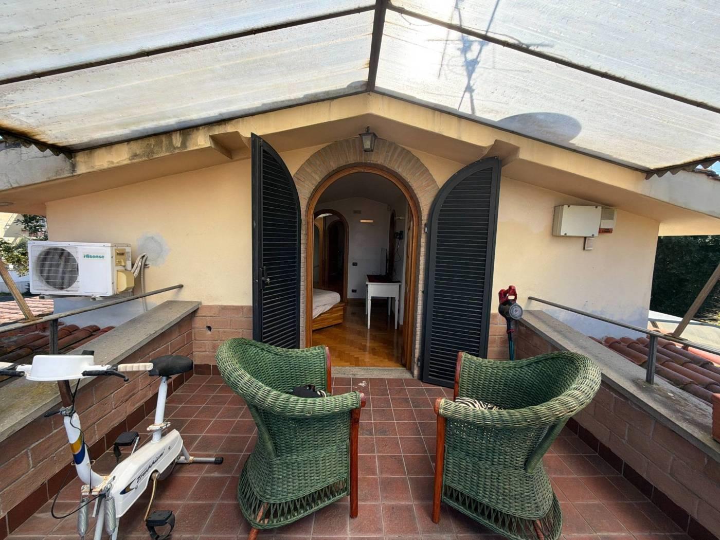 Il piano superiore ospita la zona notte, composta da due camere matrimoniali, entrambe con bagno privato, oltre ad un ulteriore ambiente attualmente adibito a cabina armadio. Da questo livello si accede ad una terrazza di circa 15 mq, ideale come sfogo esterno riservato.