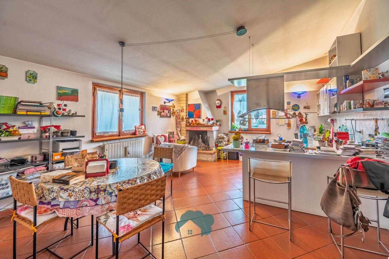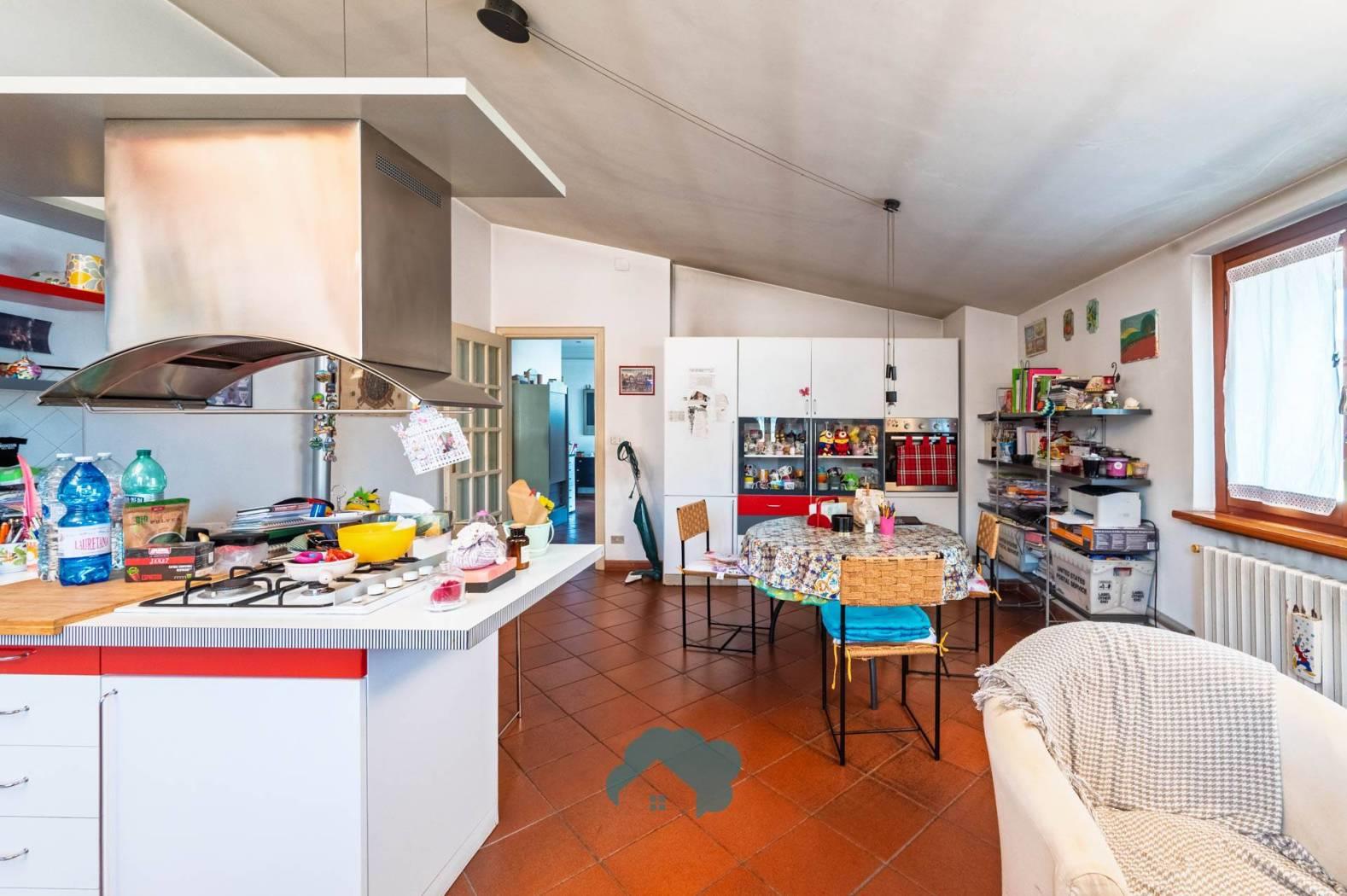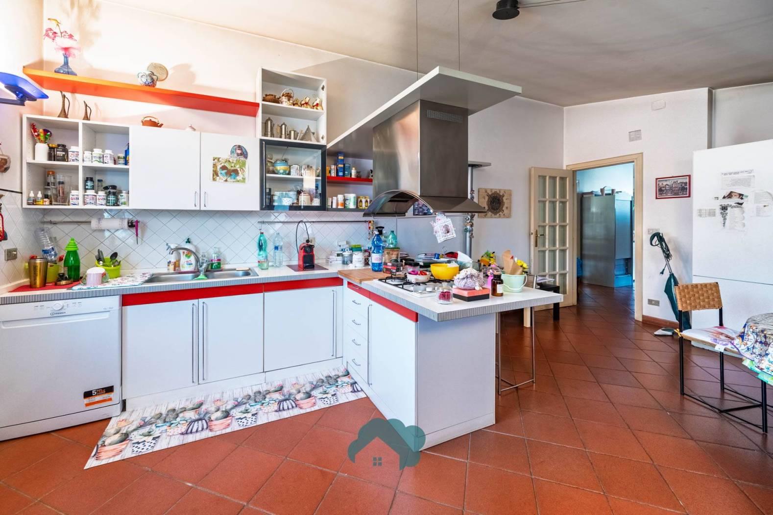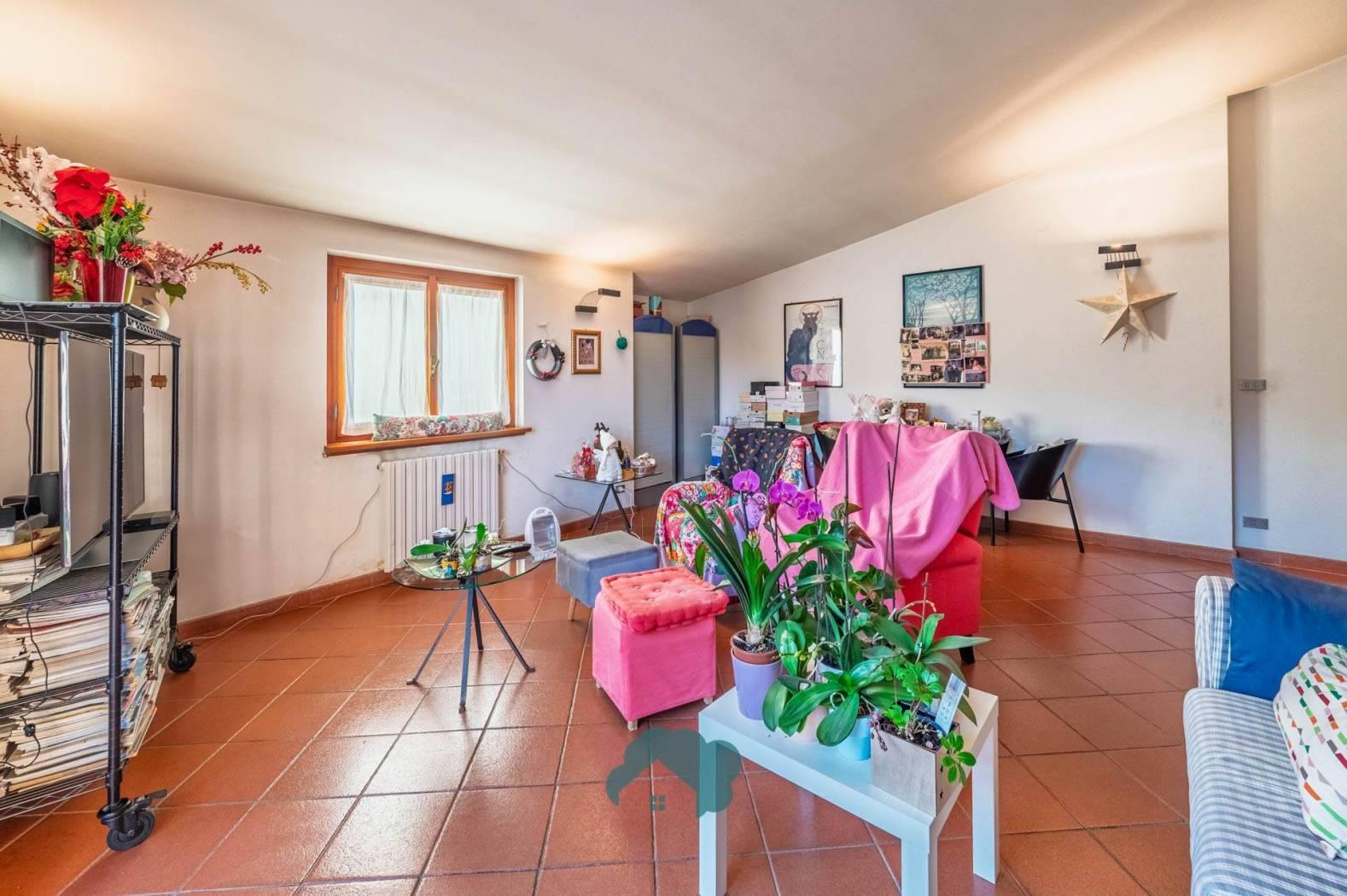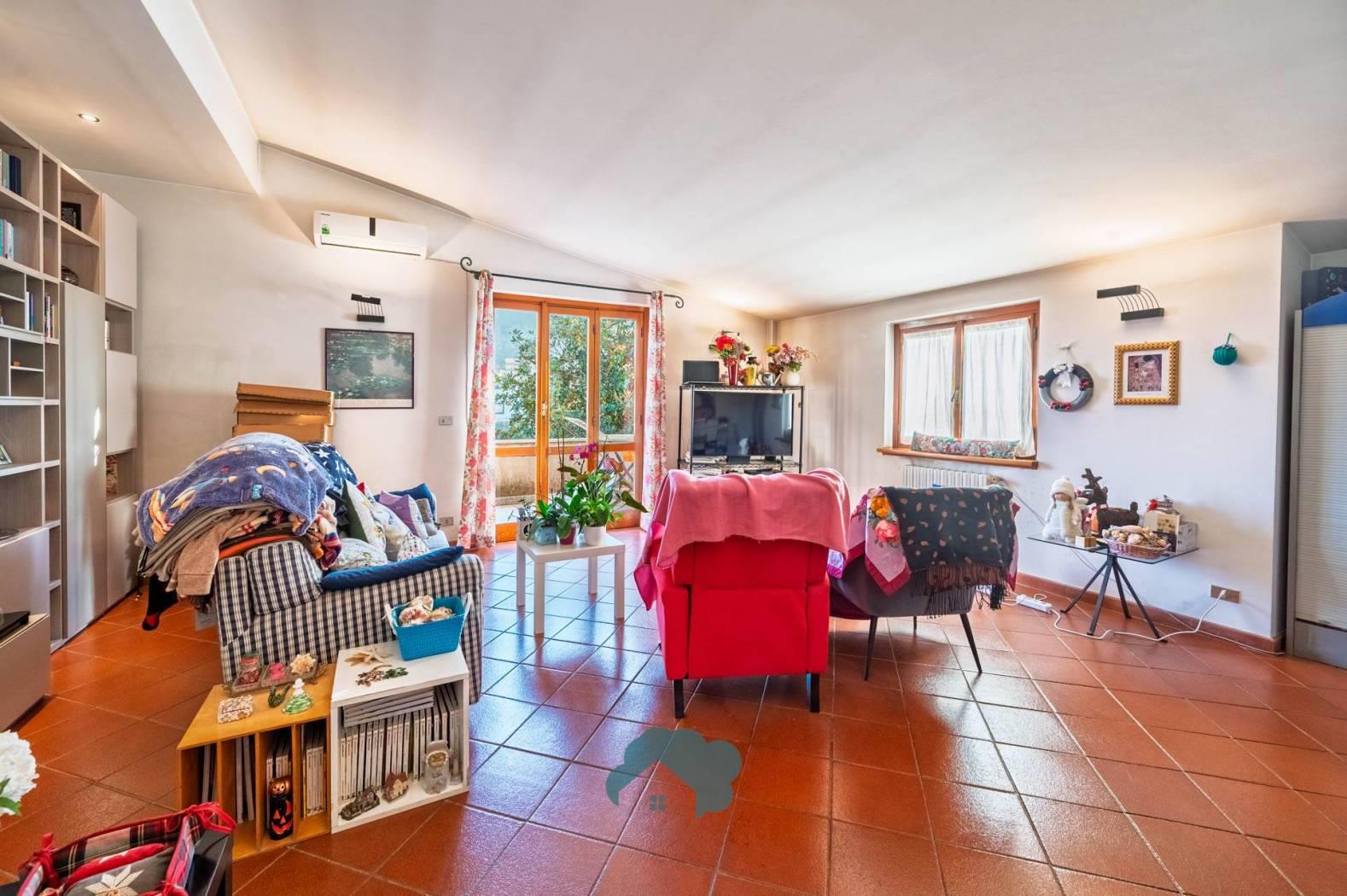 Completano la proprietà un garage di circa 75 mq e una cantina di circa 70 mq, situati al piano terra, oltre a un giardino pianeggiante di circa 800 mq, in parte pavimentato e in parte adibito ad area verde.