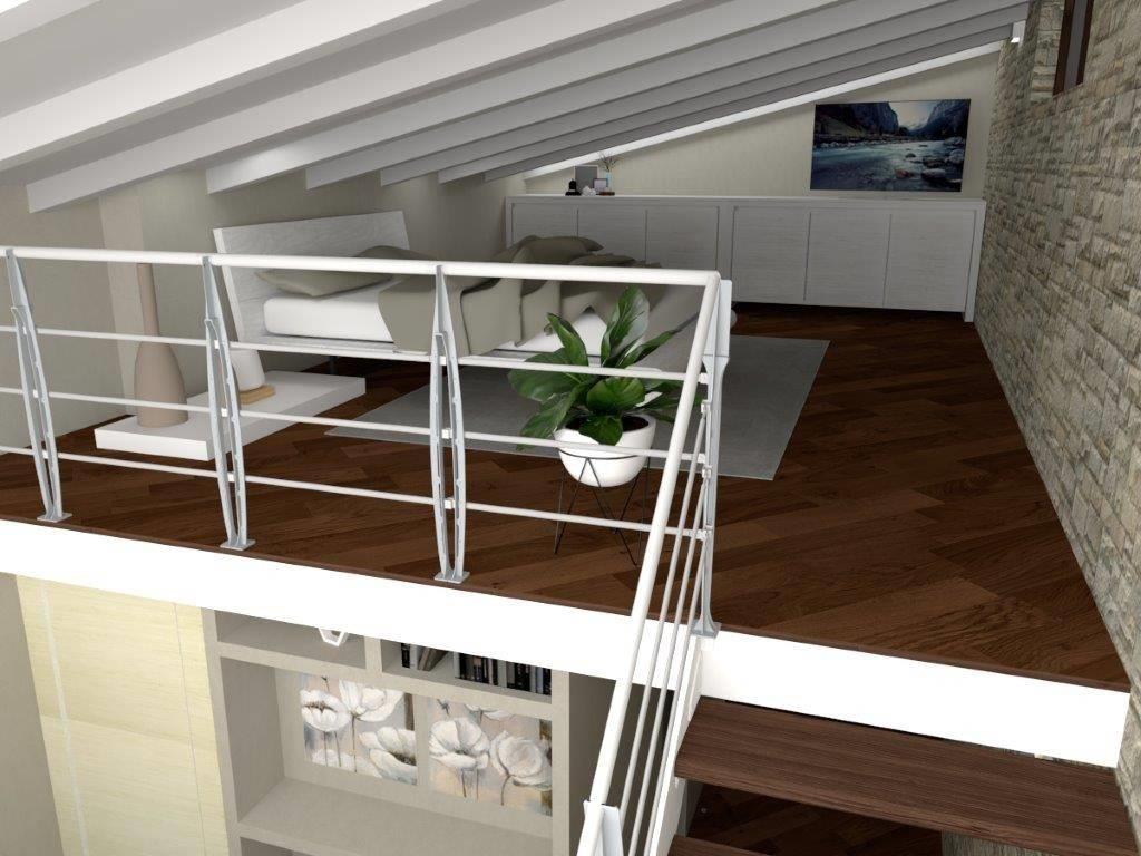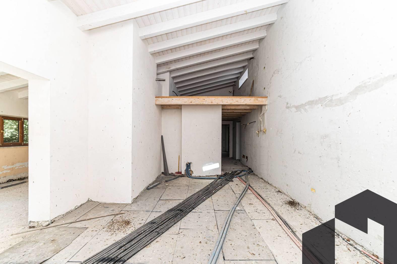 L’importante altezza dei soffitti ha permesso la realizzazione di un raffinato soppalco in legno, che aggiunge valore e versatilità agli spazi, ideale come zona TV, area relax o studio.