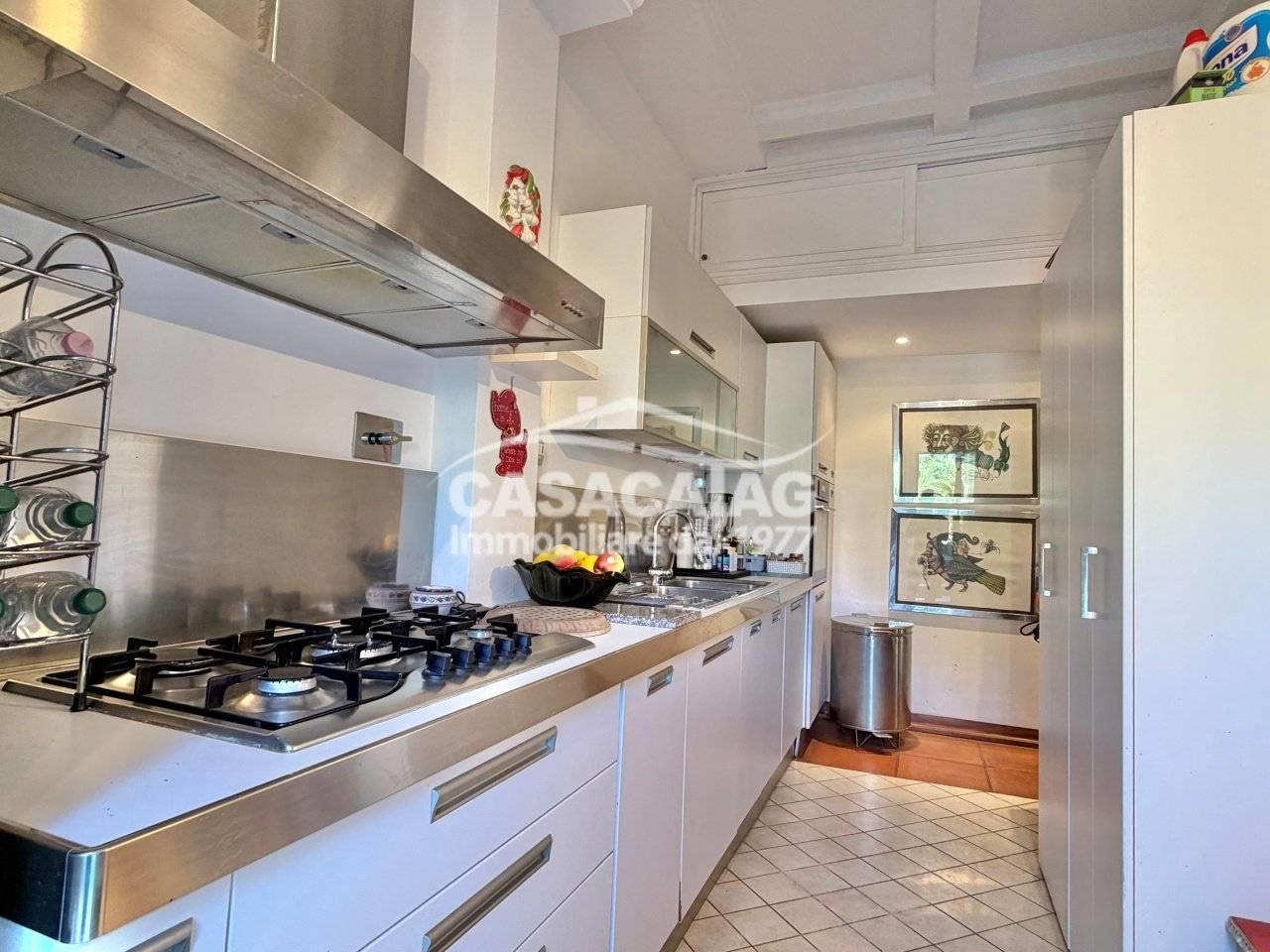 La villa al suo interno si compone di un ampio ingresso di rappresentanza, un salone triplo scenografico con soffitto di oltre 4 metri e luminosissimo, grazie alle vetrate tutta altezza, 3 camere da letto, 3 bagni (due dei quali interni alle camere), vari disimpegni e una ariosa cucina con accesso diretto alla parte posteriore del giardino dove trovano spazio, come detto, gazebo e spazi conviviali.
