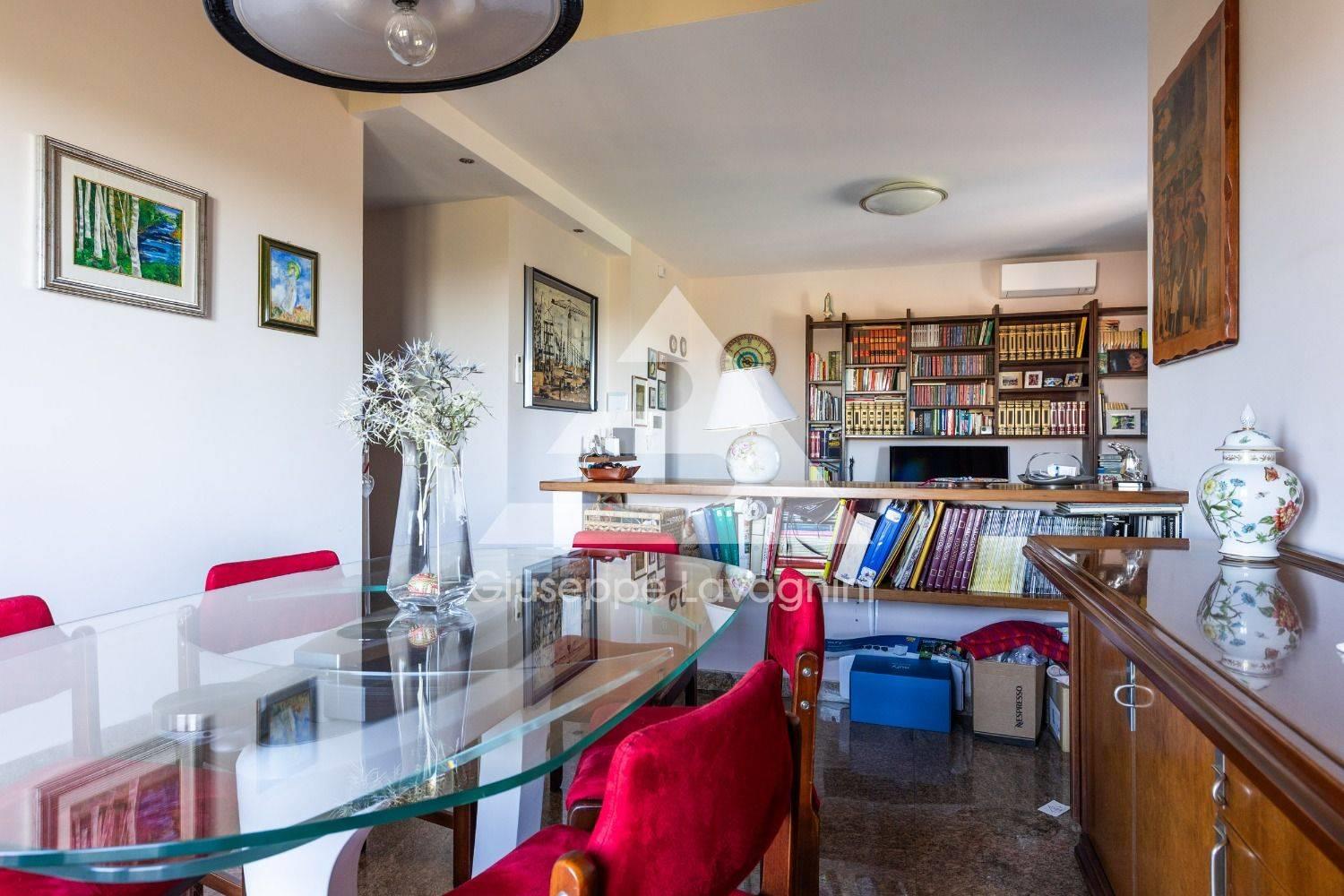 Un delizioso appartamento con soggiorno e cucina a vista, balcone panoramico, due camere da letto e bagno.