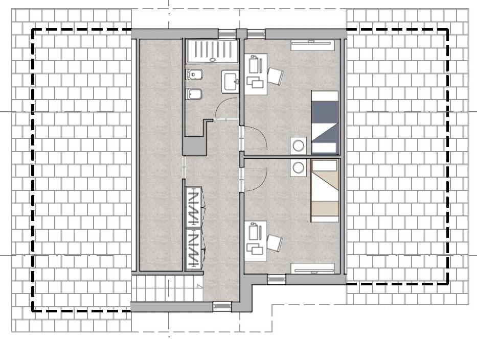 Il piano superiore, di 40 mq, ospita due ulteriori camere e un lavatoio, con un’altezza al colmo di 2,40 m che assicura un’ottima vivibilità degli spazi.