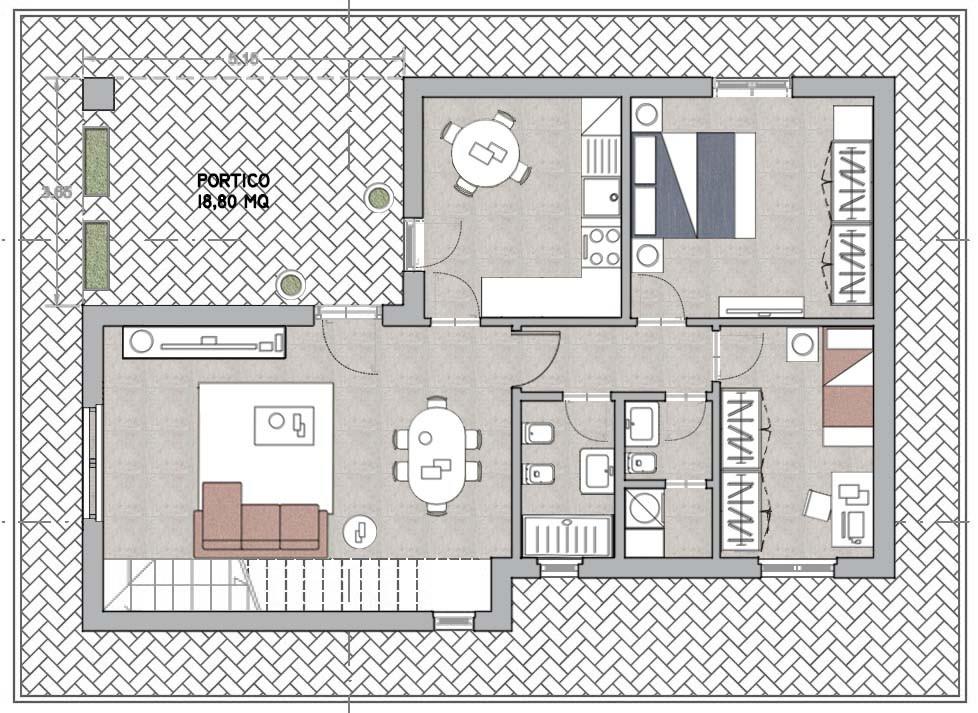 Al piano terra, di circa 90 mq, troviamo un ampio salone ideale per la vita quotidiana e per accogliere ospiti, una cucina spaziosa, due camere da letto, un bagno e una comoda lavanderia. Completa il piano un portico di 19 mq, perfetto per momenti di relax all’aperto o per pranzi e cene in compagnia.