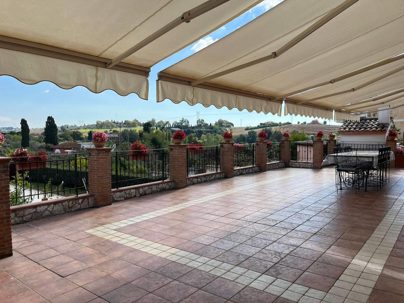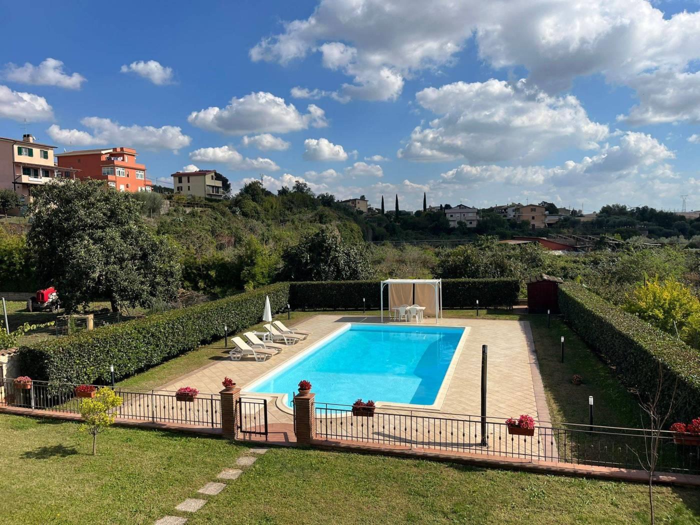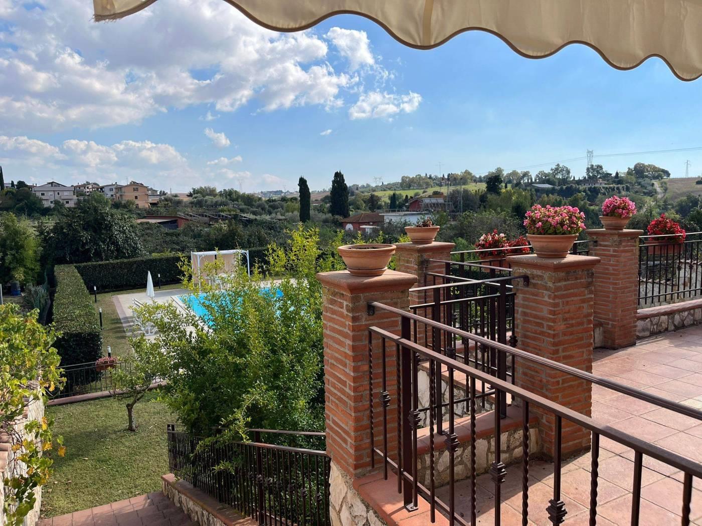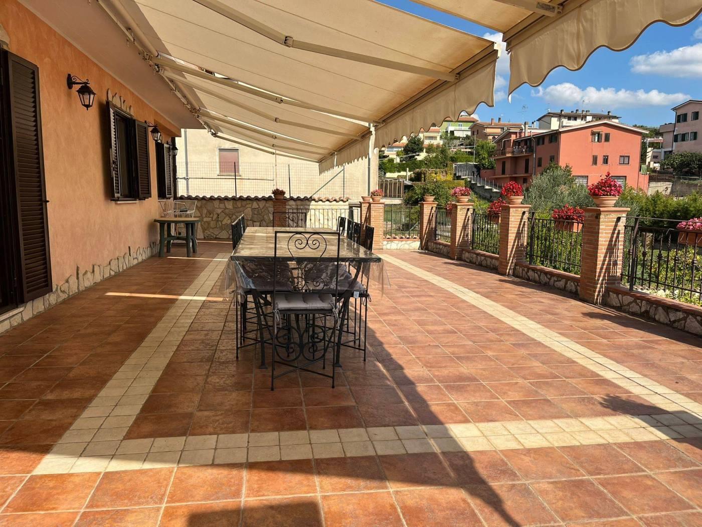COLLE DEI PINI: In contesto riservato ma adiacente ai principali collegamenti proponiamo la vendita di una villa unifamiliare su tre livelli fuori terra stile casale di recente costruzione divisibile con doppio ingresso . L'immobile è di ampia metratura ed è composto al piano rialzato da un soggiorno con cucina a vista, due camere matrimoniali, un servizio ed un' ampia dispensa. Al piano primo da due camere mansardate ed un servizio. Al piano terra che ha anche un ingresso indipendente troviamo una grande sala hobby con termo camino, forno a legna, cucina a vista ed un servizio. Completano la proprietà una grande e conviviale terrazza abitabile da 80 mq circa con affaccio sulla proprietà esterna della dimensione di 1.000mq circa con piscina e tre posti auto coperti. L' immobile è dotato di un impianto fotovoltaico da 4,5 kw per la produzione di elettricità con incentivi fino al 2033, oltre la predisposizione per i pannelli solari. E' dotato inoltre della predisposizione per i condizionatori nelle camere, caldaia a condensazione, finestre con doppi vetri ,inferiate in ferro con serrature e zanzariere su tutti gli infissi, allarme perimetrale interno ed esterno con radar interni suddivisi per piani, pozzo per l' irrigazione , tende elettriche esterne e videocitofoni.
