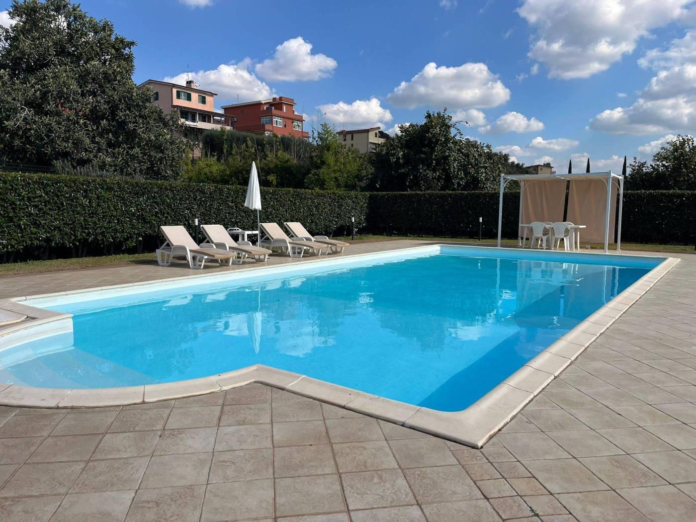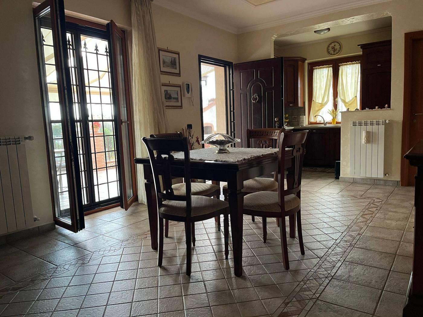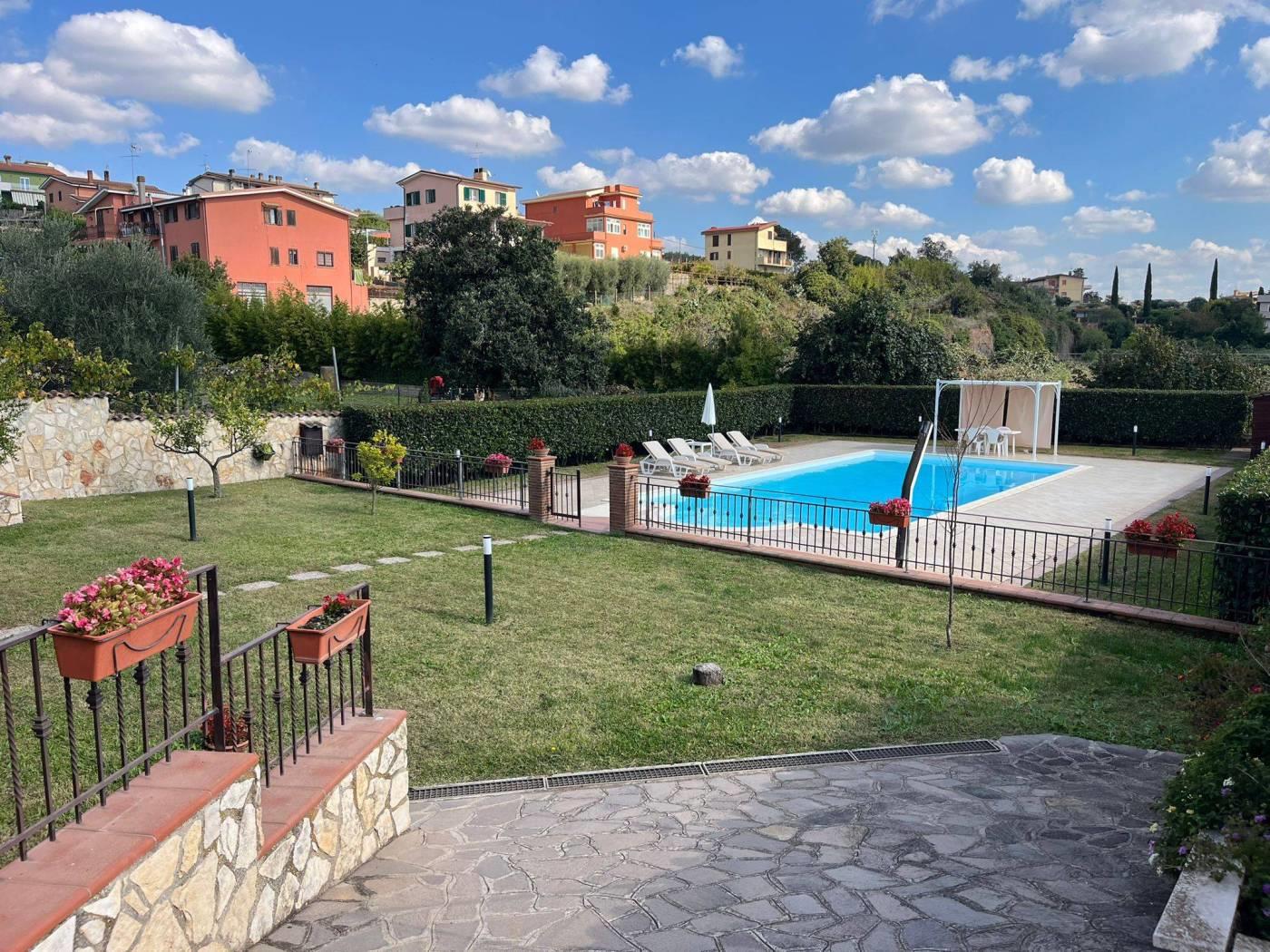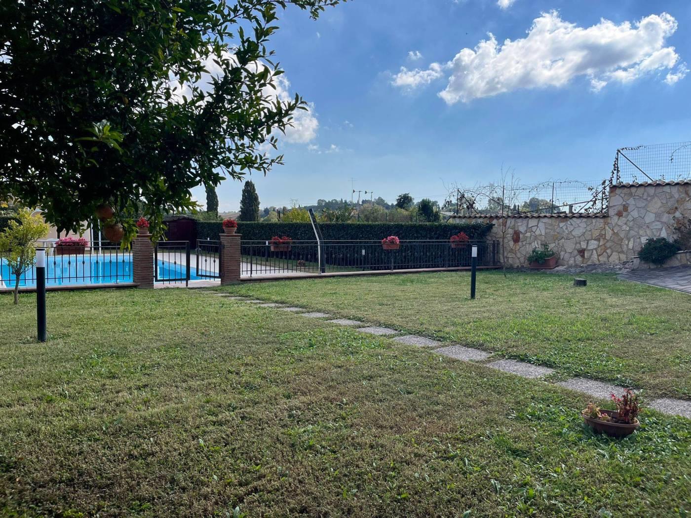 COLLE DEI PINI: In contesto riservato ma adiacente ai principali collegamenti proponiamo la vendita di una villa unifamiliare su tre livelli fuori terra stile casale di recente costruzione divisibile con doppio ingresso . L'immobile è di ampia metratura ed è composto al piano rialzato da un soggiorno con cucina a vista, due camere matrimoniali, un servizio ed un' ampia dispensa. Al piano primo da due camere mansardate ed un servizio. Al piano terra che ha anche un ingresso indipendente troviamo una grande sala hobby con termo camino, forno a legna, cucina a vista ed un servizio. Completano la proprietà una grande e conviviale terrazza abitabile da 80 mq circa con affaccio sulla proprietà esterna della dimensione di 1.000mq circa con piscina e tre posti auto coperti. L' immobile è dotato di un impianto fotovoltaico da 4,5 kw per la produzione di elettricità con incentivi fino al 2033, oltre la predisposizione per i pannelli solari. E' dotato inoltre della predisposizione per i condizionatori nelle camere, caldaia a condensazione, finestre con doppi vetri ,inferiate in ferro con serrature e zanzariere su tutti gli infissi, allarme perimetrale interno ed esterno con radar interni suddivisi per piani, pozzo per l' irrigazione , tende elettriche esterne e videocitofoni.