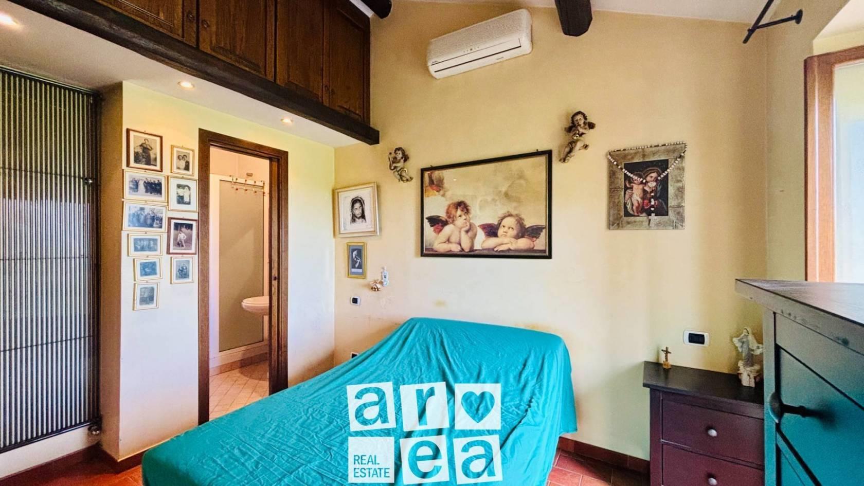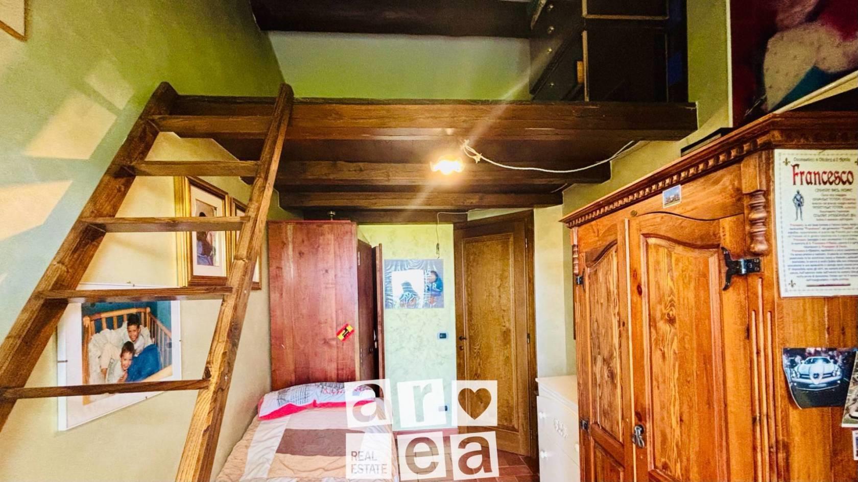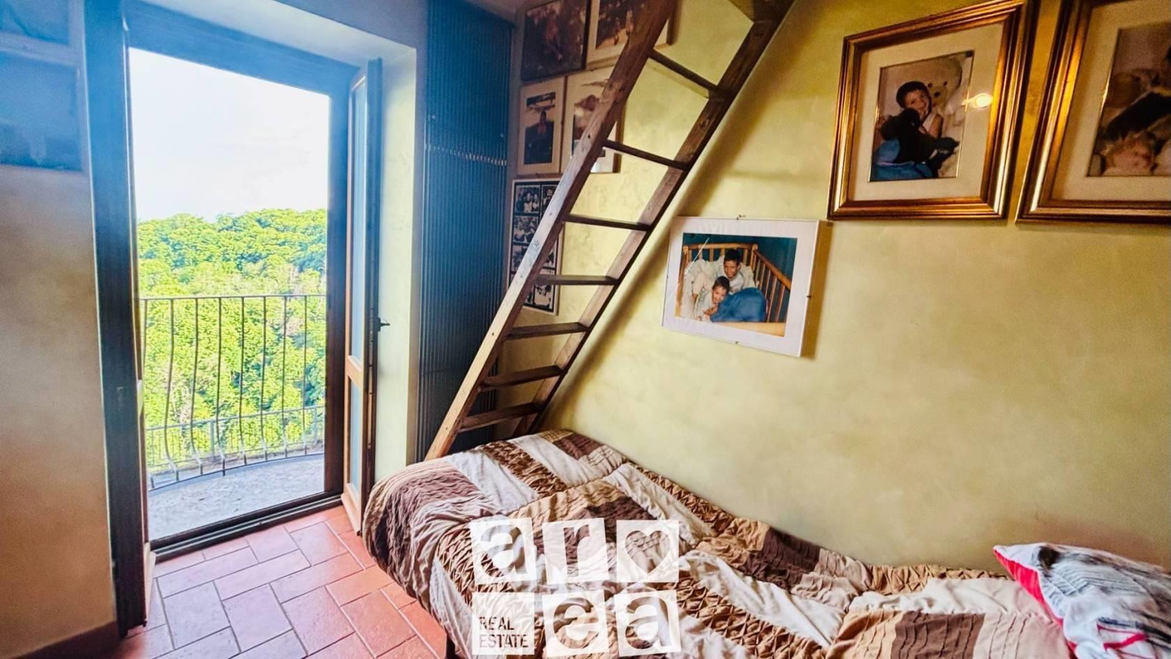 La scala a chiocciola ci conduce al piano superiore, dove si sviluppa la zona notte: qui troviamo una spaziosa camera matrimoniale con bagno privato e una seconda camera, adatta sia come cameretta che come studiolo. In entrambe le stanze troviamo i balconi, dai quali si può godere di una vista aperta sulle colline circostanti e sull’ambiente naturale tipico della zona.