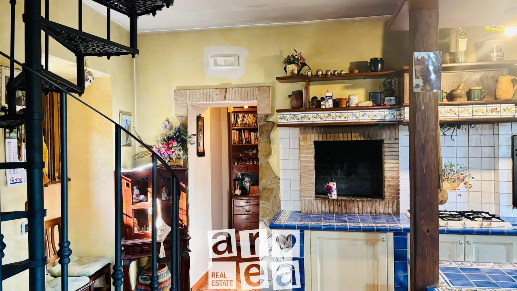Al piano terra, la zona giorno: un ampio e luminoso salone con angolo cottura, un ripostiglio e un servizio con vasca idromassaggio.