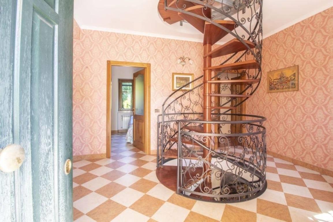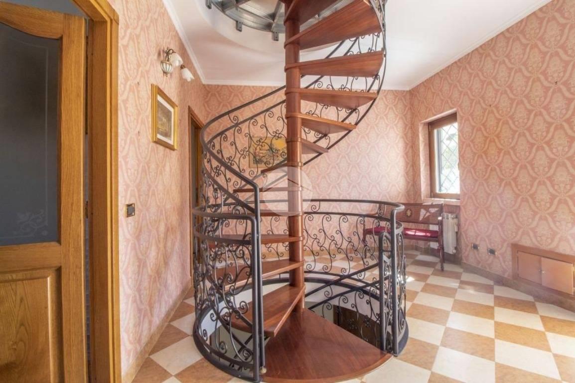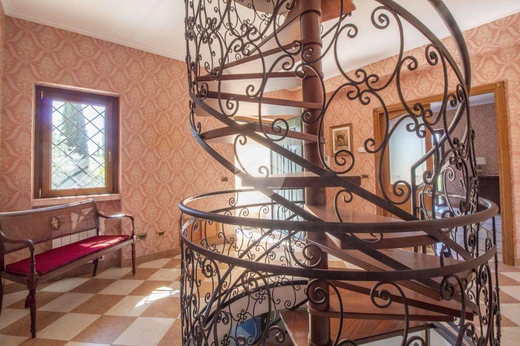 Al Piano Terra: la luce domina gli spazi. L’ingresso si apre su un disimpegno con una scenografica scala a chiocciola in ferro battuto e noce, che collega i tre piani. Da un lato si trovano lo studio e il salone di rappresentanza, con ampie porte-finestre, che affacciano su un terrazzo panoramico dal quale godere di una splendida vista sulle colline e sul borgo di Moricone. Completano il piano una camera singola, il bagno finestrato rivestito con ceramiche di Vietri e dotato di box doccia, un’anticamera, ideale come cabina armadio, e una camera matrimoniale.