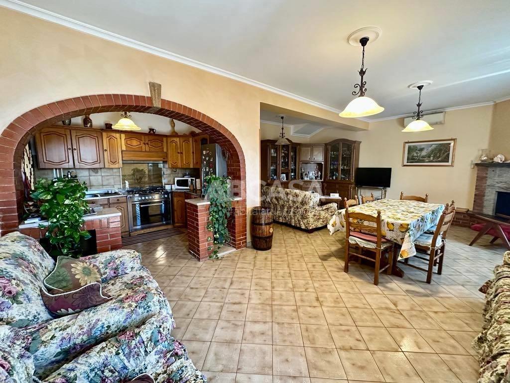 Il salone accogliente, dotato di camino, è il cuore della casa, mentre l'angolo cottura a vista rende la cucina un luogo conviviale.