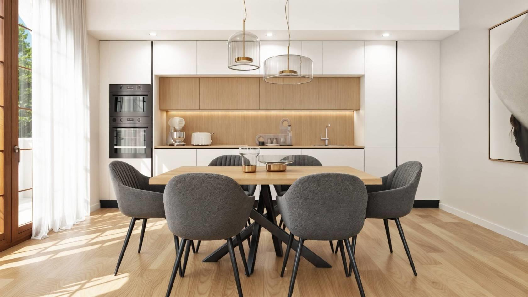 pranzo e la cucina a vista si integrano perfettamente, creando un ambiente arioso,funzionale e ricercato, dove ogni dettaglio è pensato con cura.