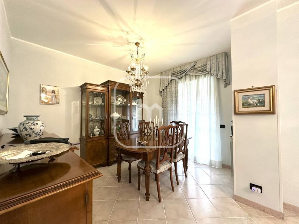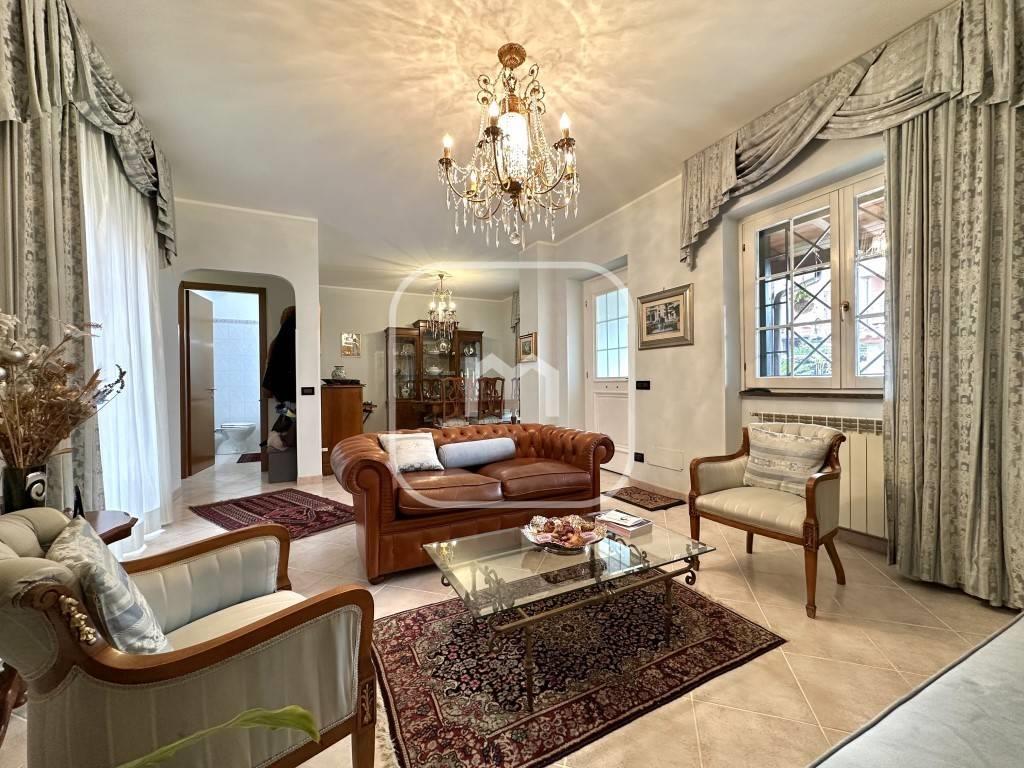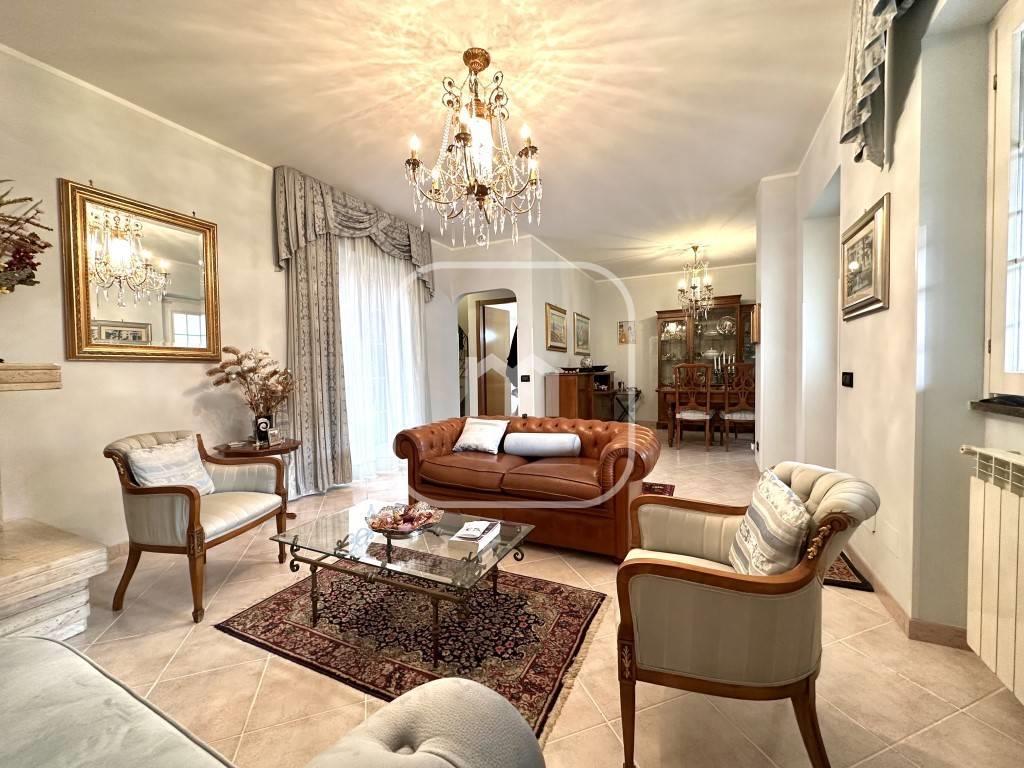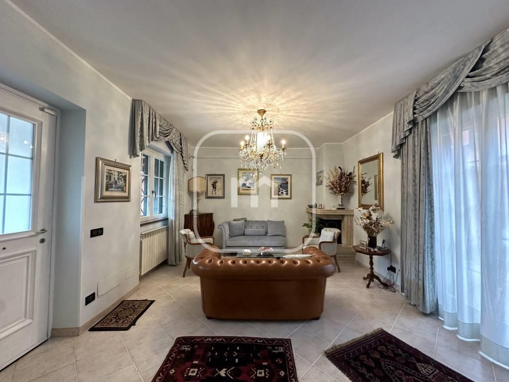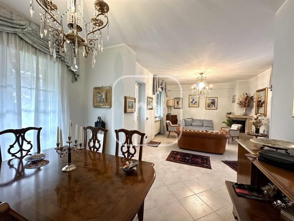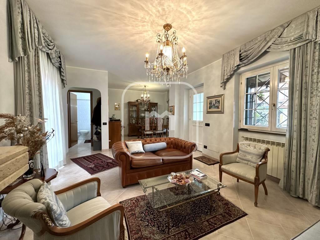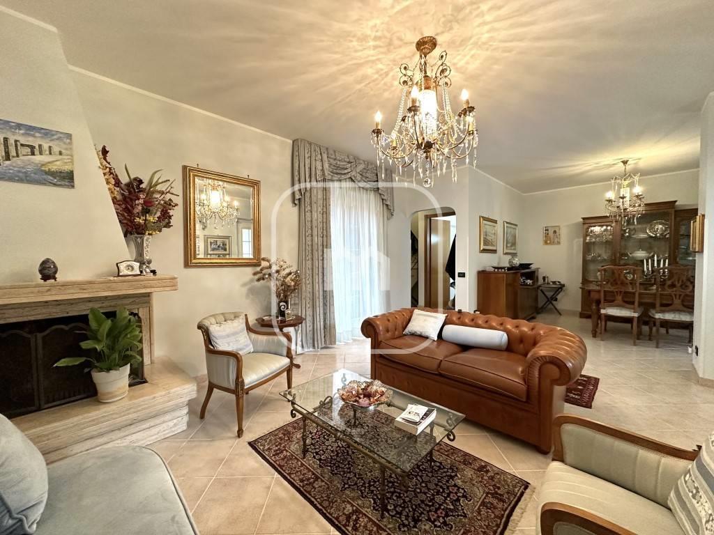 Dal portone blindato si accede al piano principale, dove troviamo un luminoso doppio salone, attualmente suddiviso in area living e sala da pranzo, impreziosito da un elegante caminetto e con accesso diretto ad un ampio terrazzo con affaccio interno, spazio riservato e vivibile. Il piano è completato da un bagno di servizio e da una spaziosa cucina abitabile, anch’essa con uscita diretta sul terrazzo.