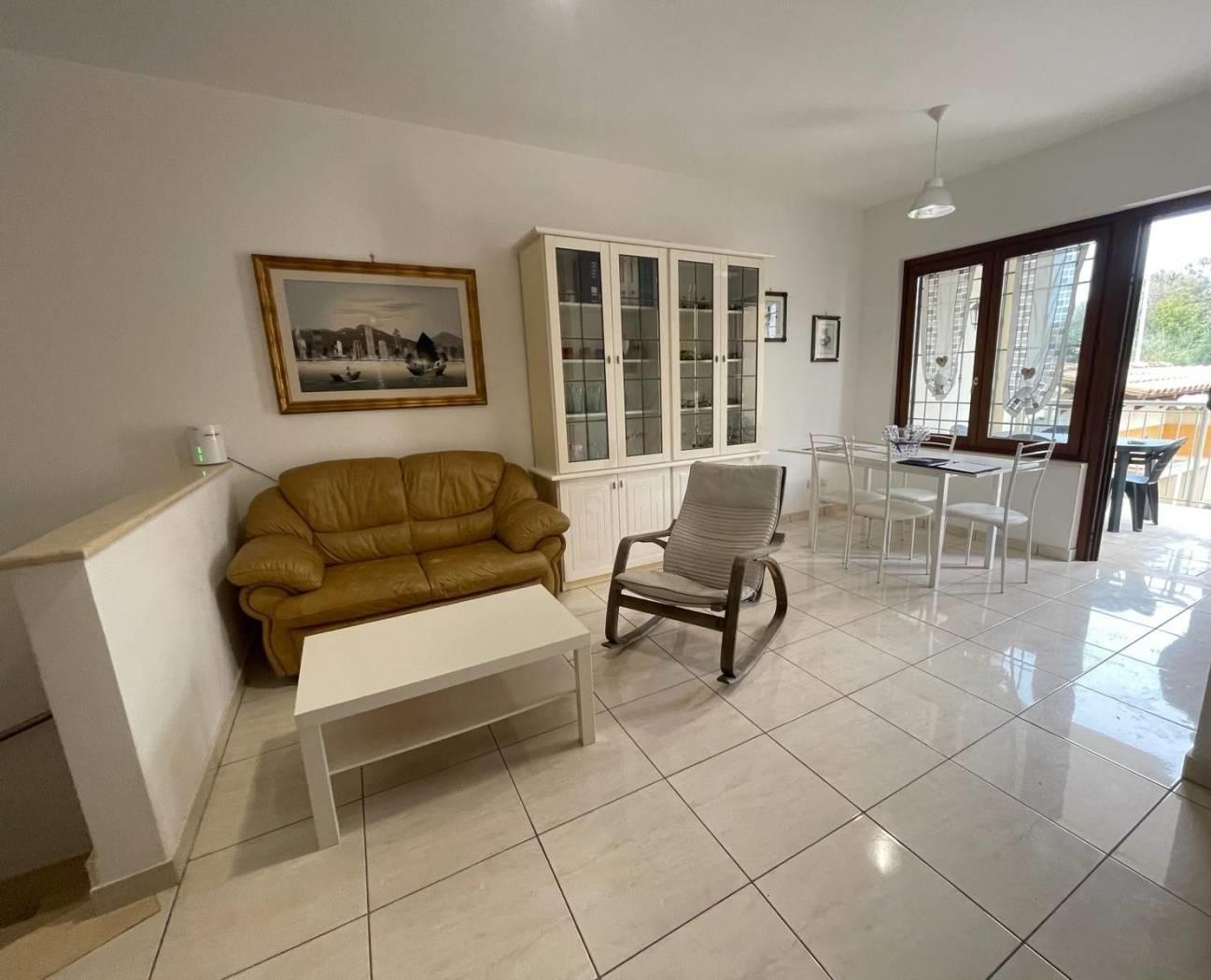 La cucina, anch'essa completamente arredata, è separata e dispone di una penisola; completa il piano terra un servizio dotato di box doccia.