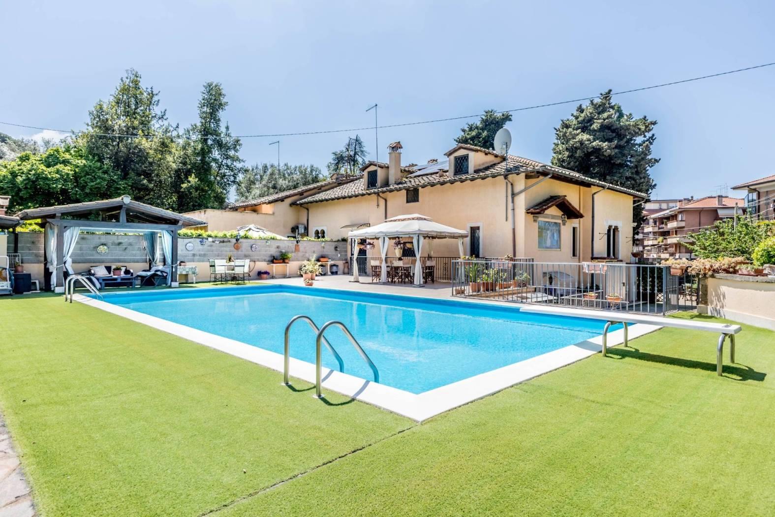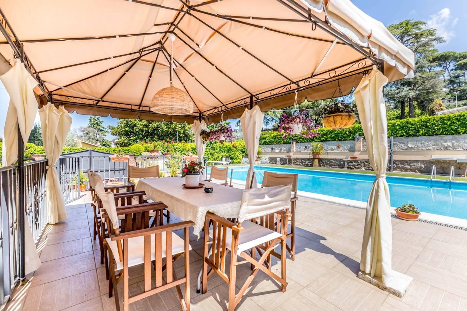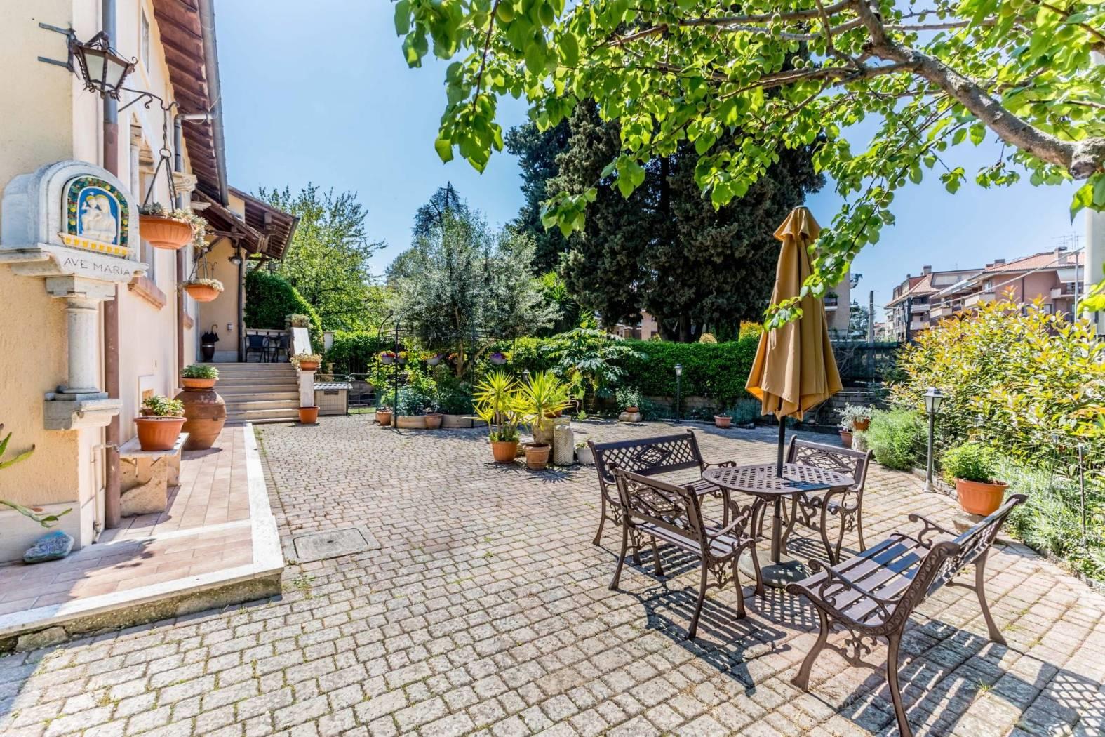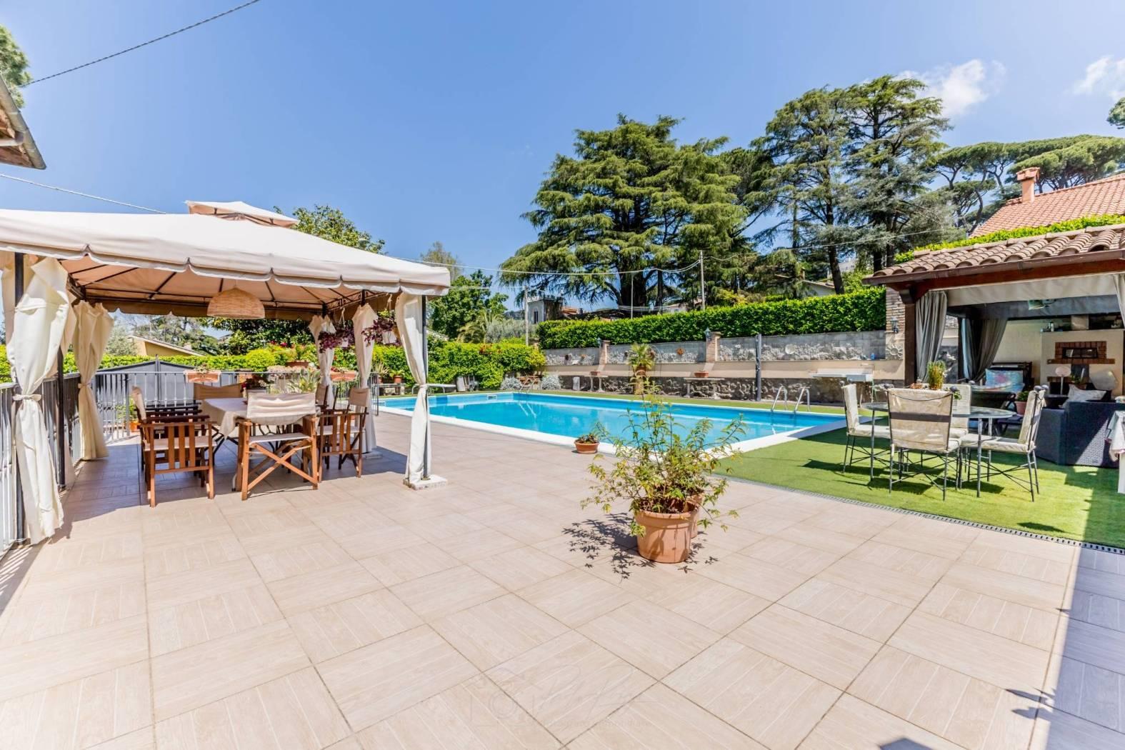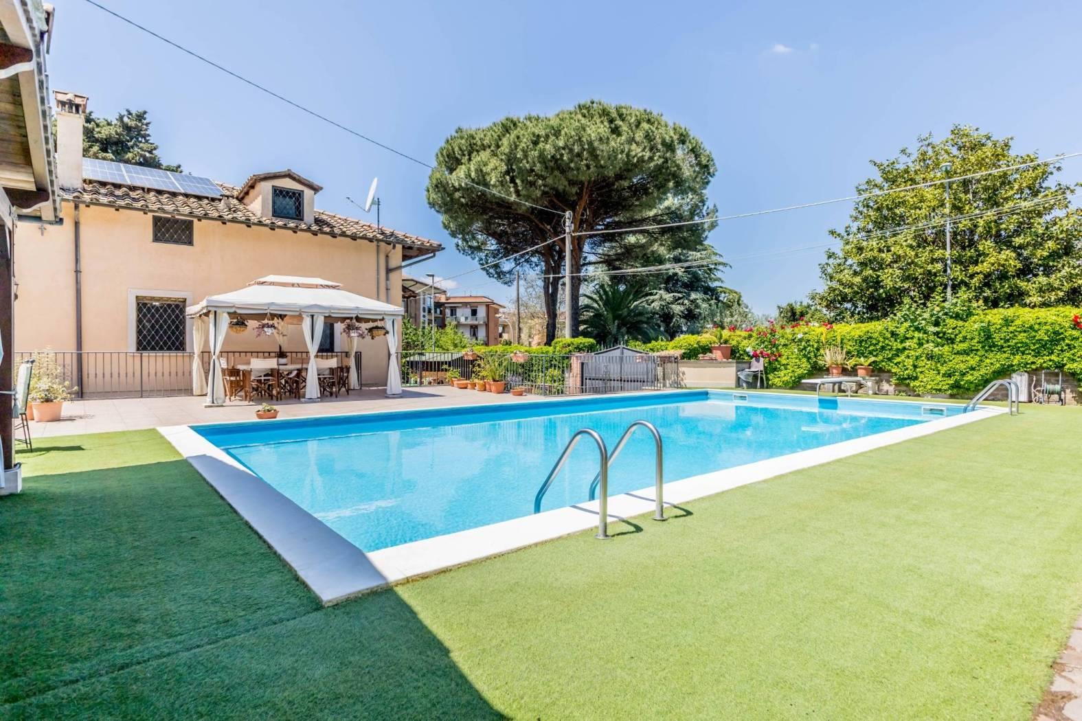 Ingresso indipendente, presenta un giardino su due livelli dove nel primo troviamo, aiuole e verde attrezzato con fioriture ed essenze, ed in parte pavimentato, mentre nella parte superiore una piscina con altezza massima 2,40 che invita a momenti di relax.