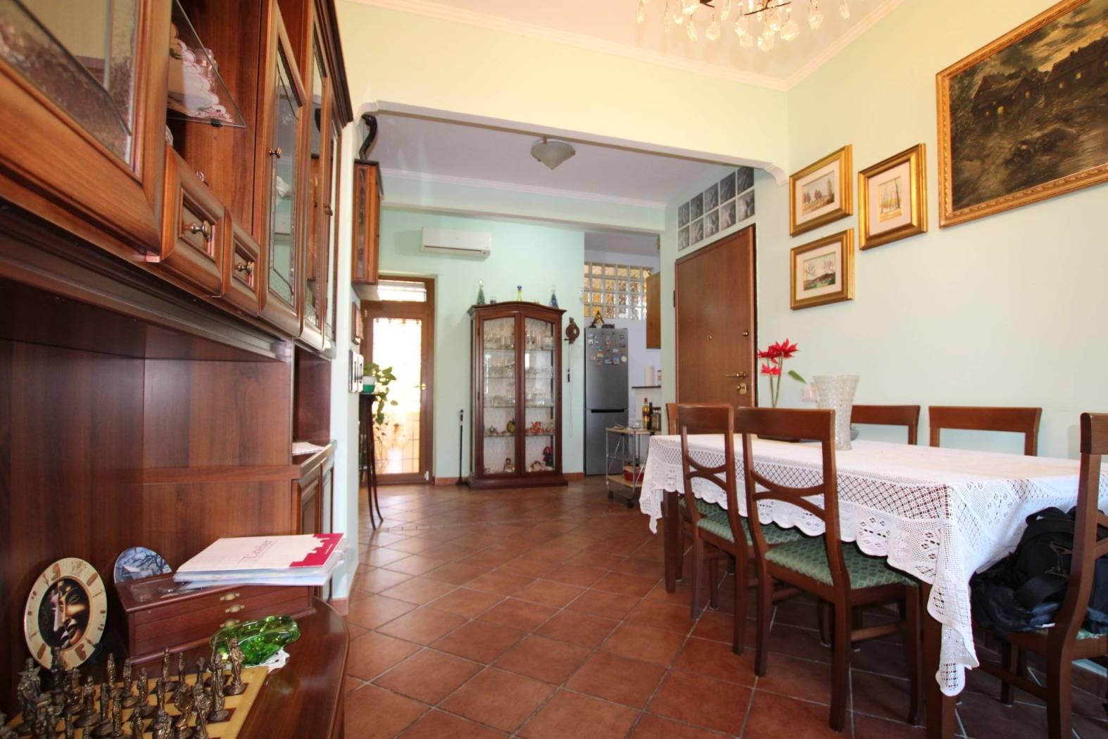 Doppio ingresso dal giardino perimetrale, salone, cucina abitabile, 2 camere, cameretta, tre bagni, possibilità quarta camera.