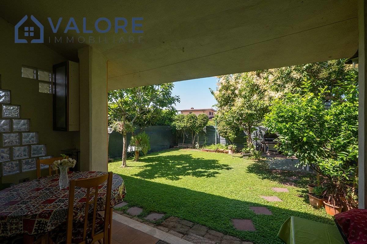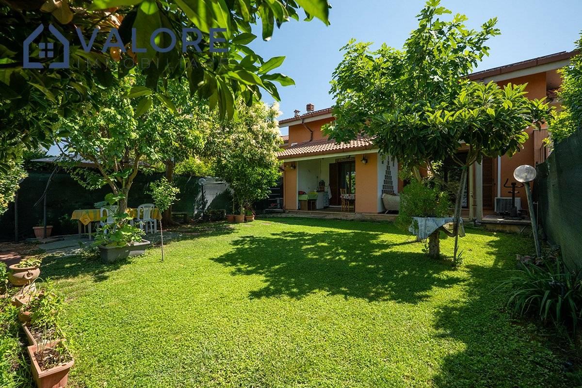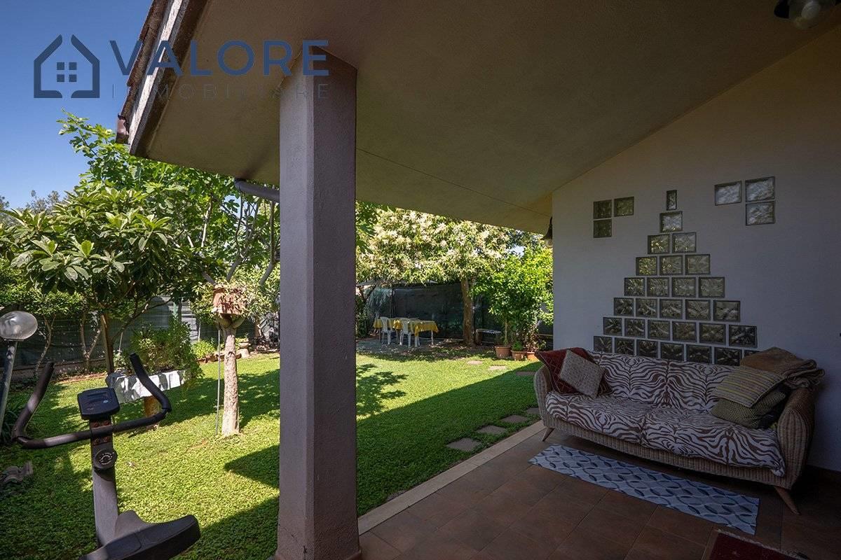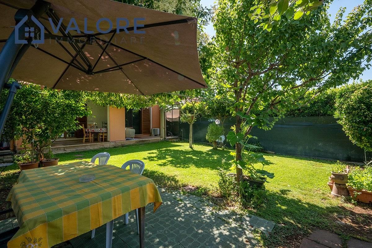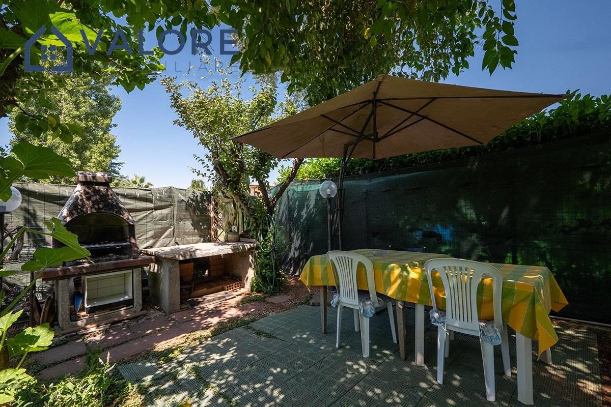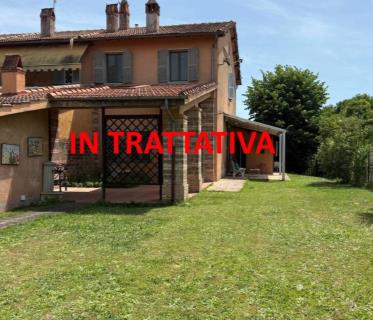 Piano Terra: soggiorno con camino con doppia esposizione, cucina, disimpegno, camera, bagno con vasca e finestra, terrazzo con portico, patio e ampio giardino attrezzato di circa 110 mq con alberi da frutto.
