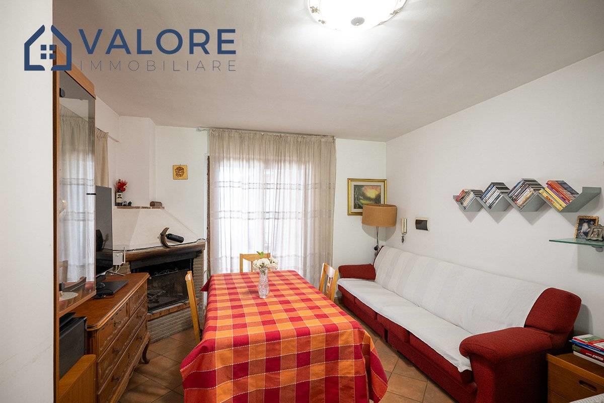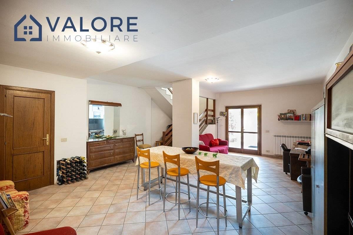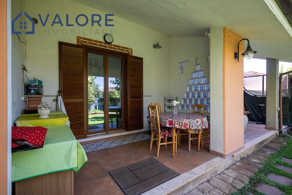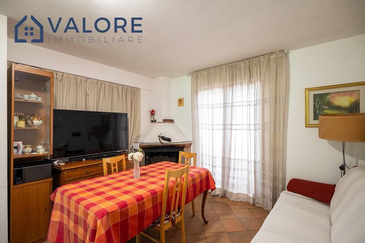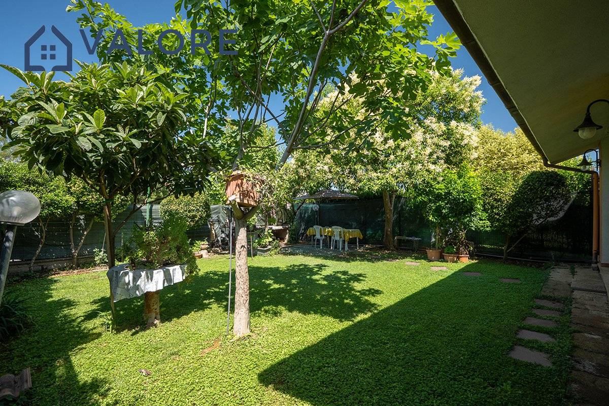 Piano Terra: soggiorno con camino con doppia esposizione, cucina, disimpegno, camera, bagno con vasca e finestra, terrazzo con portico, patio e ampio giardino attrezzato di circa 110 mq con alberi da frutto.