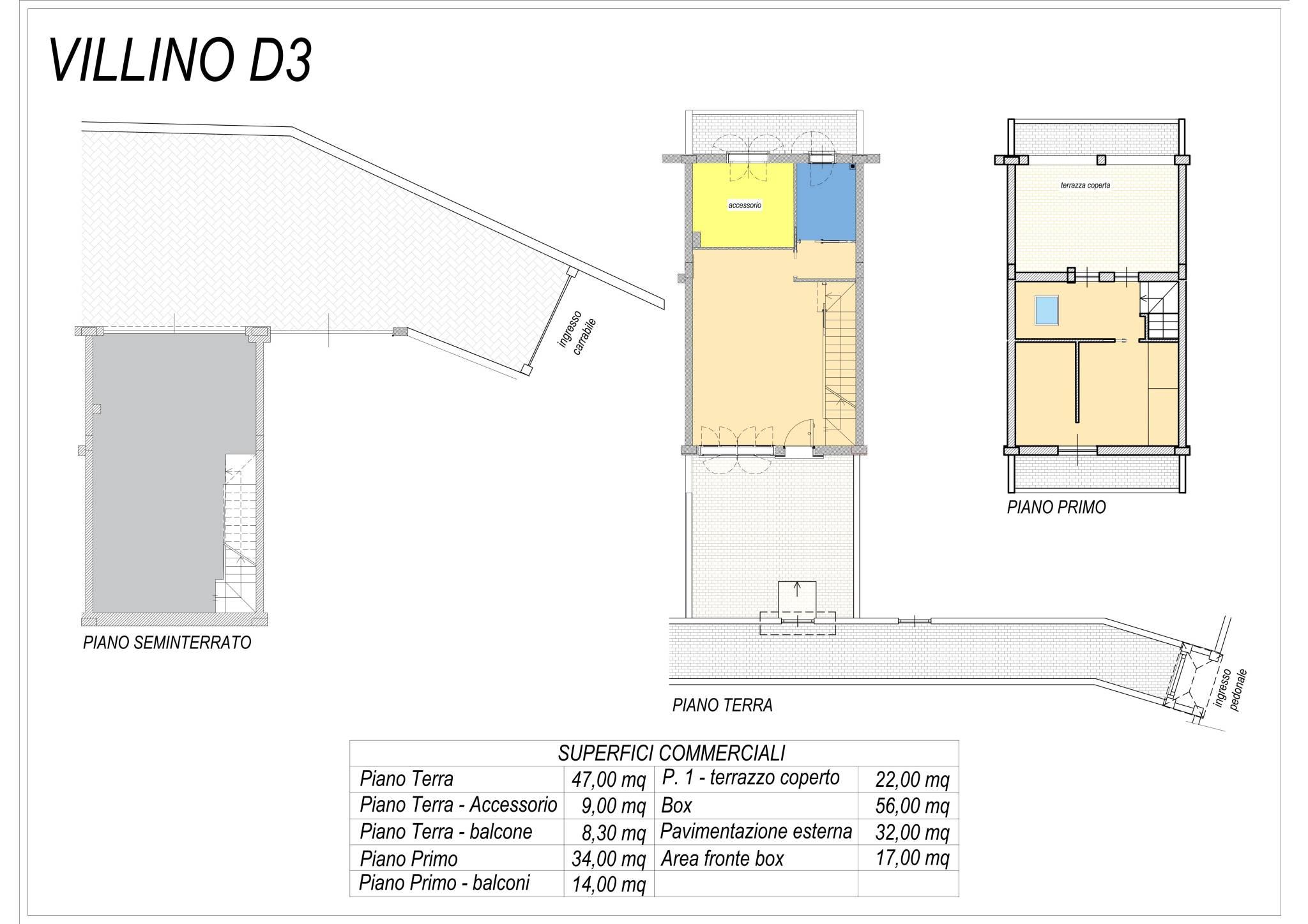 impresa di costruzioni vende villino a schiera posto su tre livelli di nuova costruzione ed indipendente con superficie commerciale interna di mq. 112 e con un cortile privato di mq. 32 commerciali e grande garage chiuso (mq. 56) con basculante automatizzata e posto auto scoperto fronte garage.