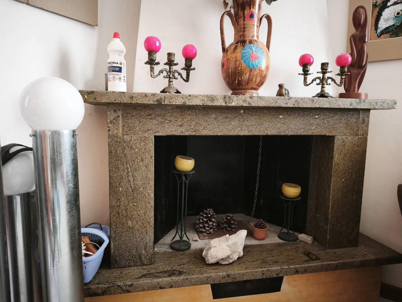 PT: Soggiorno con camino, cucuna abitabile, camera matrimoniale, bagno, patio e giardino.