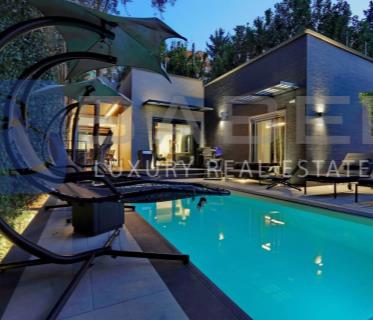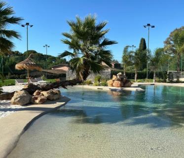 Al piano terra troviamo un elegante ingresso che conduce a un salotto con aria condizionata e camino, una cucina funzionale e un bagno di servizio. La zona notte ospita due camere da letto e un bagno con doccia. Al primo piano, una splendida suite con vestiaire, bagno privato dotato di vasca idromassaggio e un balcone con affaccio sul verde.