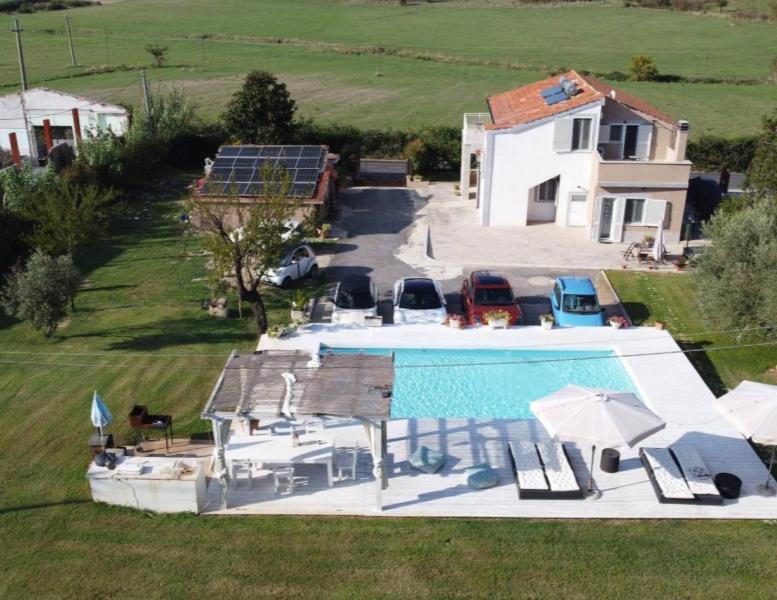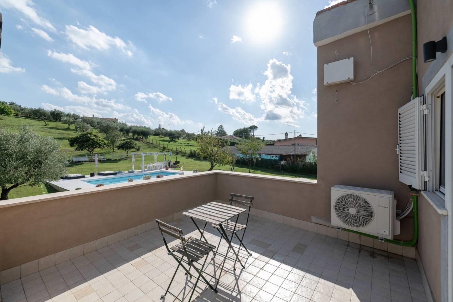La vera magia si compie all'esterno, dove si estende il parco privato di ben quattromila metri quadrati, un vero polmone verde che circonda la proprietà e ospita il cuore pulsante della vita estiva: una bellissima piscina fuori terra con un elegante pool deck in legno e una zona relax attrezzata, perfetta per cene, feste e pomeriggi indimenticabili.