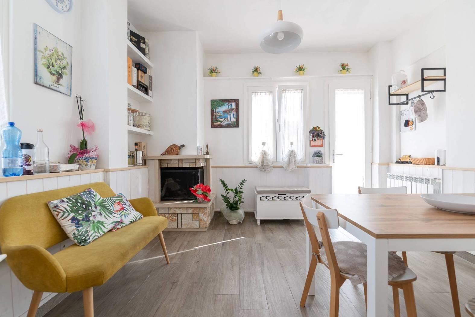 Al piano terra ti accoglie un ambiente caldo e funzionale, con un salone luminoso, una cucina abitabile completa di tinello con camino, una camera da letto matrimoniale e un bagno.
