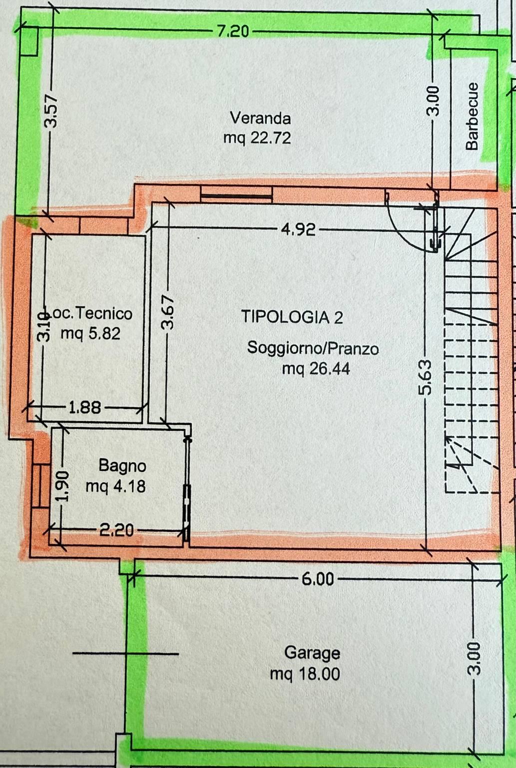 Al piano terra si trova un ampio soggiorno con cucina a vista, un bagno completo di box doccia, una veranda coperta ideale per pranzi e momenti di relax all’aperto, e un locale tecnico.
