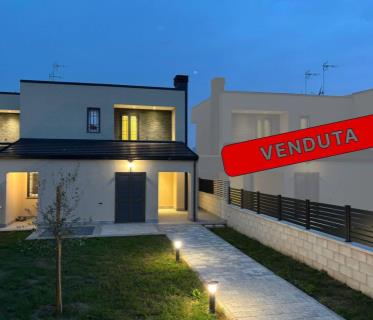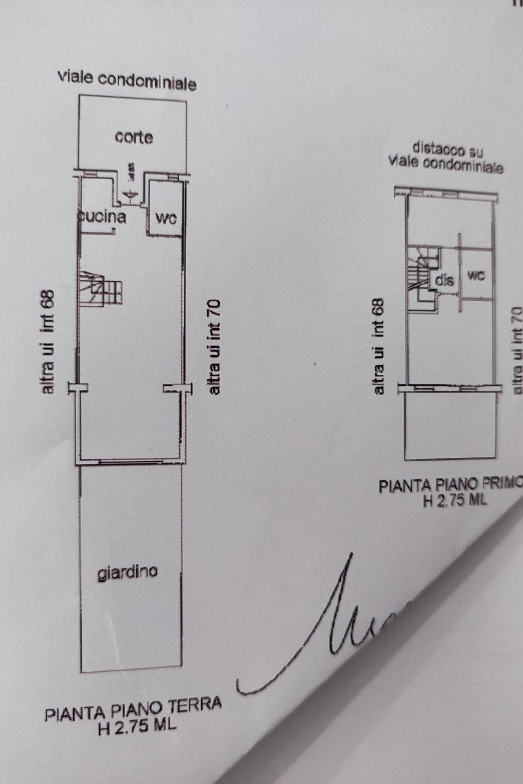 Il piano terra è composto da ingresso, ampio salone, angolo cottura, bagno finestrato con doccia. Dalla grande vetrata del salone si accede al giardino arricchito da una zona barbecue con accesso al posto auto di proprietà. Il piano primo è composto da disimpegno camera matrimoniale, cameretta e bagno con vasca.